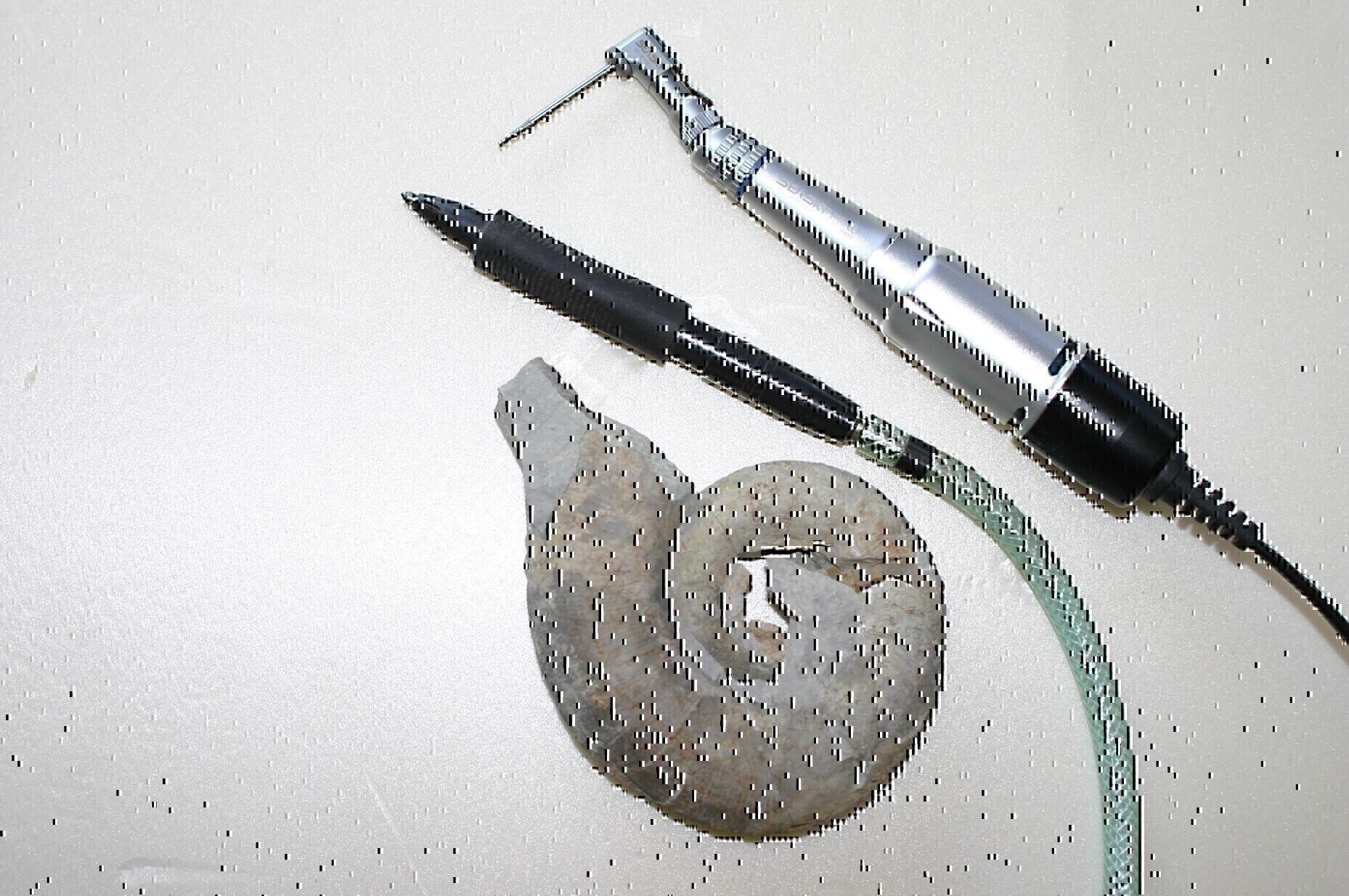 Dans l'atelier, nous utiliserons divers outils de nettoyage comme le micro-burineur ou la fraiseuse, ceci afin de nettoyer les fossiles et de mieux en révéler leurs secrets et de pouvoir les identifier.