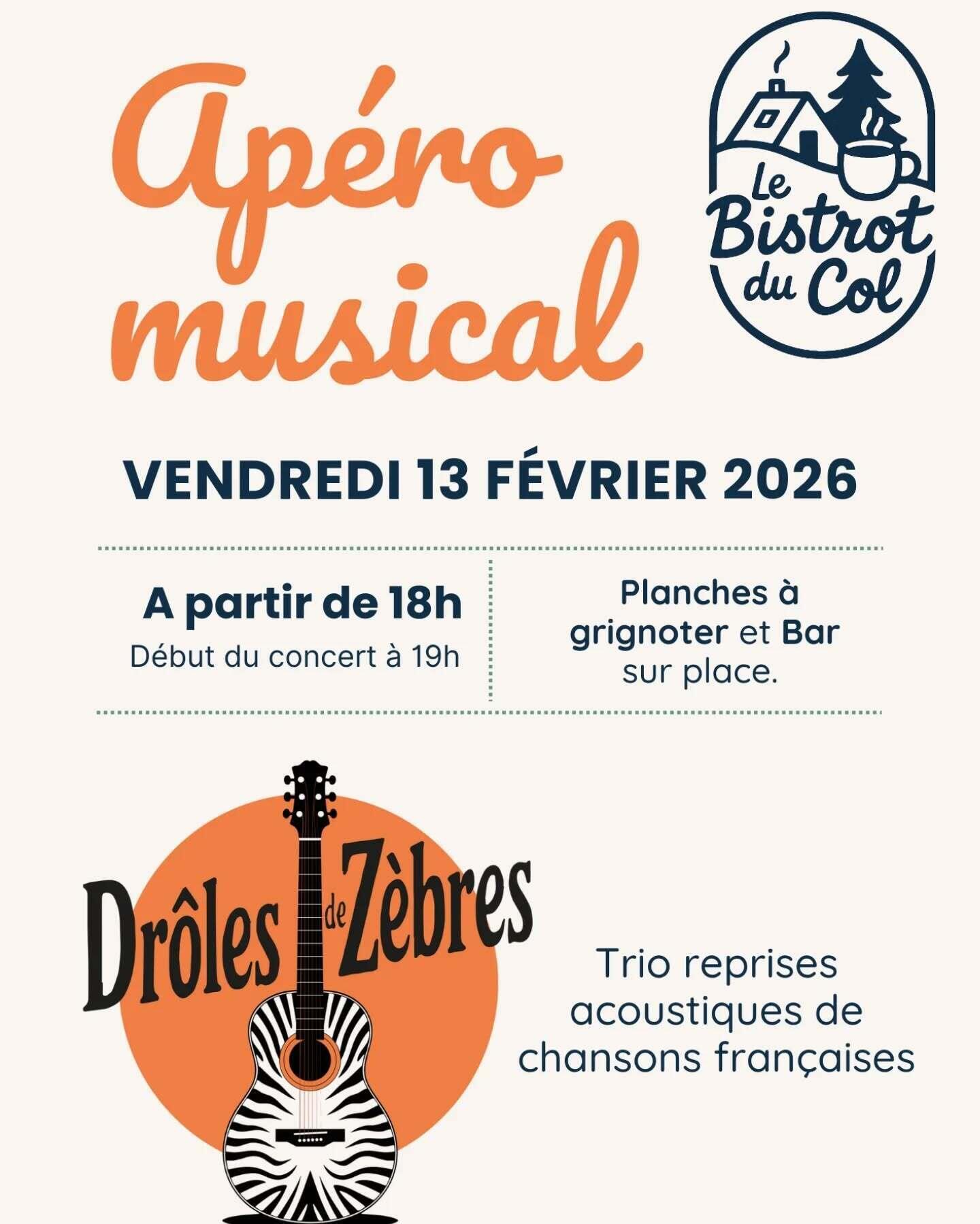 Apéro musical avec le trio Drôles de Zèbres qui reprend des chansons françaises en acoustique. Planches à grignoter et bar sur place.