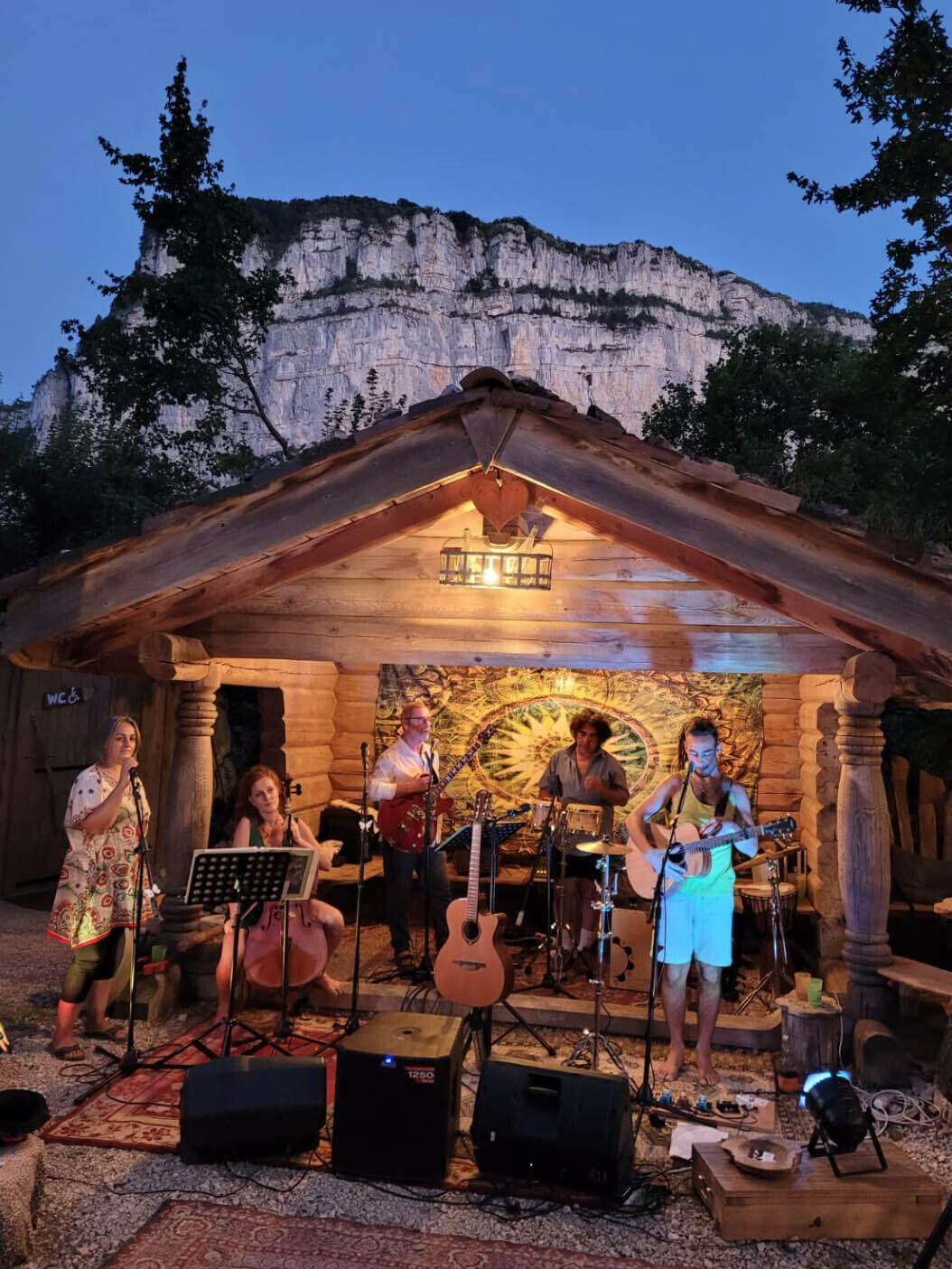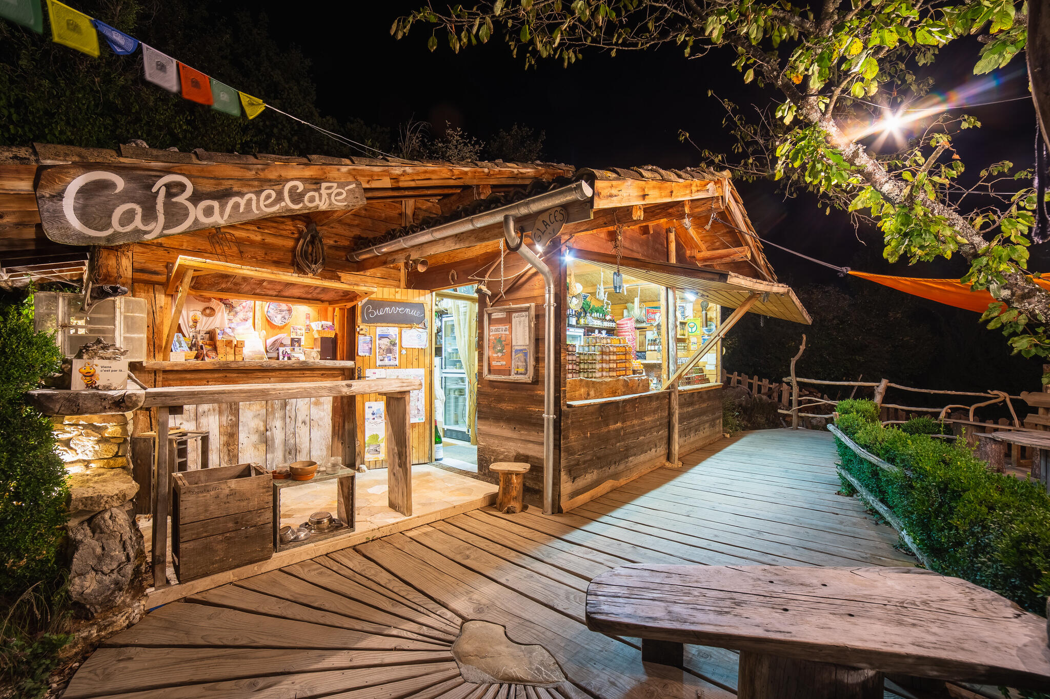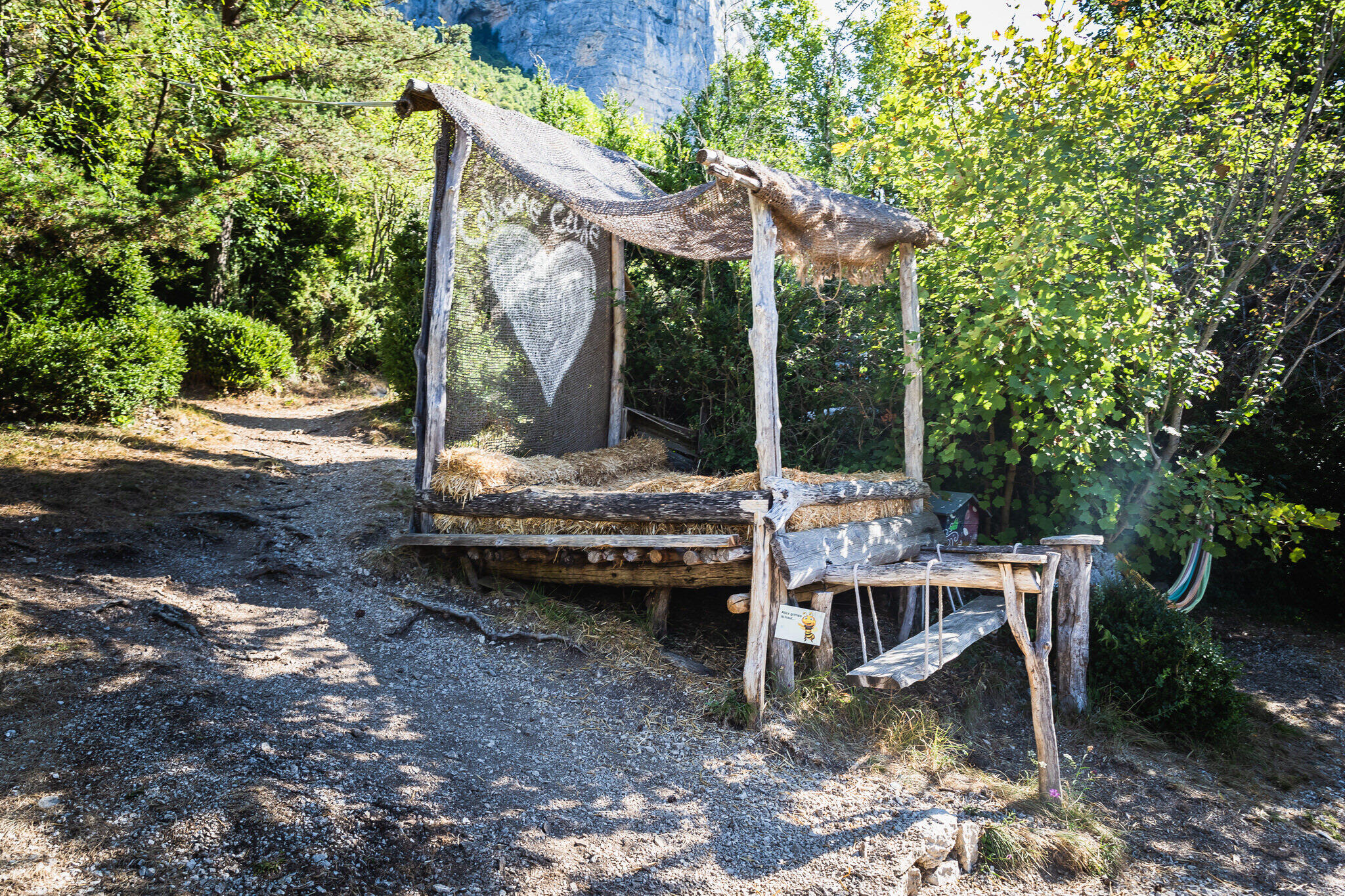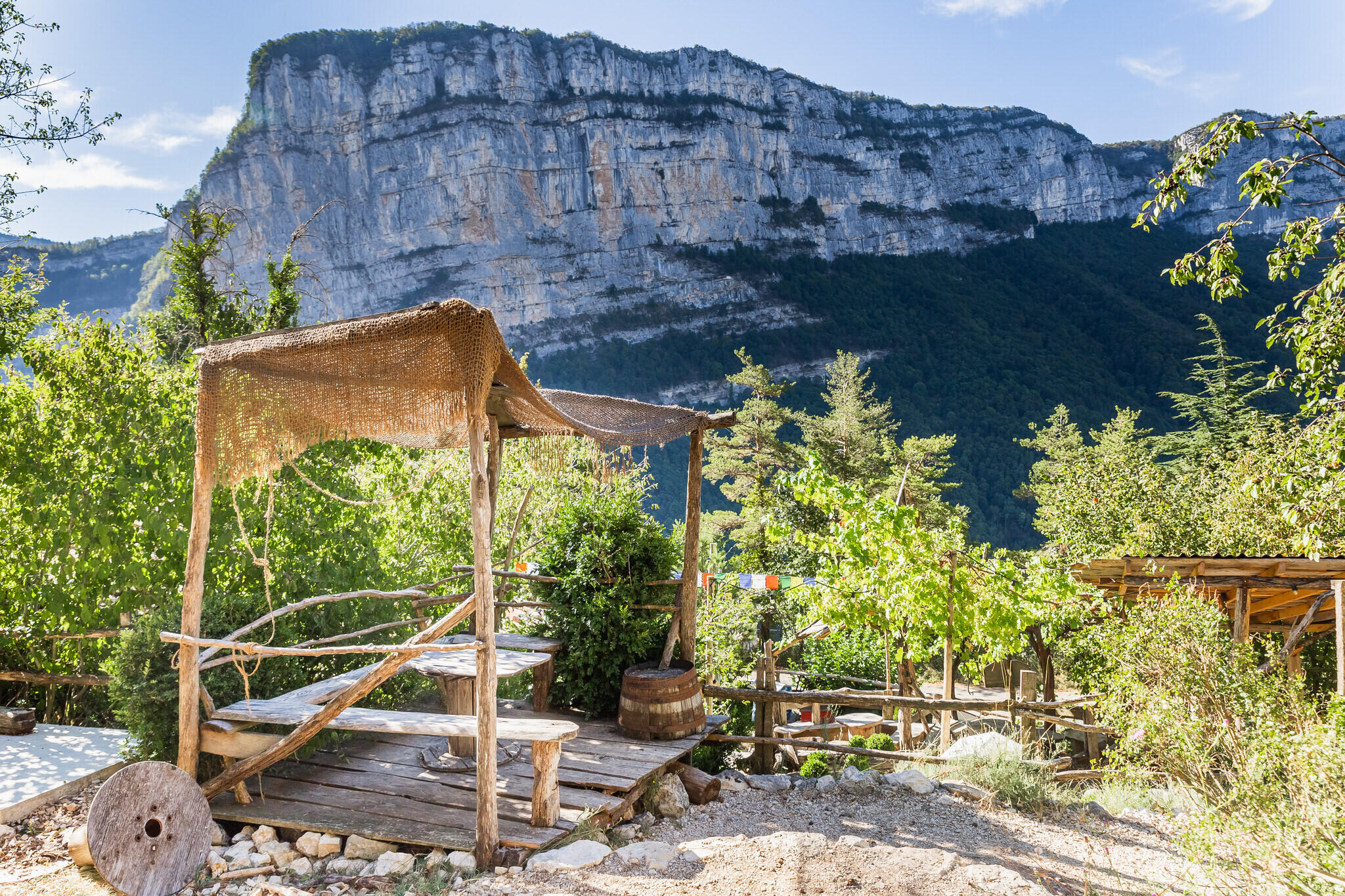 Sur un espace naturel de 8000 m2, choisissez votre lieu : une cabane, une terrasse suspendue, des hamacs ou un lit à baldaquin. Posez-vous, respirez, observez et dégustez nos produits locaux & bio sélectionnés principalement dans le Vercors.