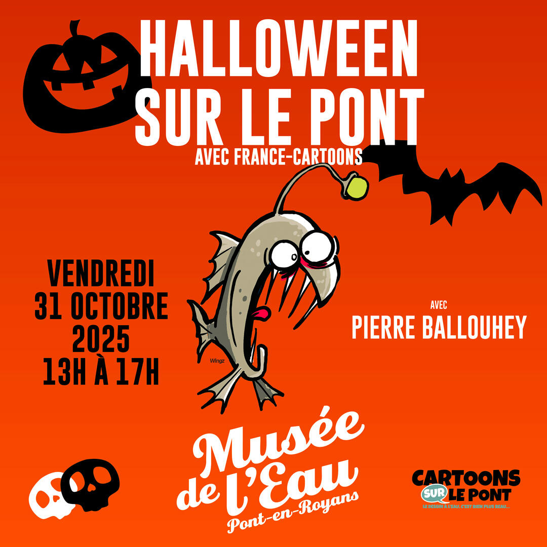 Halloween sur le Pont, c'est l'occasion pour les enfants de 7 à 13 ans de participer à un atelier de dessins avec le dessinateur local Pierre Ballouhey, de découvrir ou redecouvrir le musée de l'eau et son exposition sur le dessin de presse, et enfin de participer à une chasse aux bonbons et à un goûter d'Halloween !