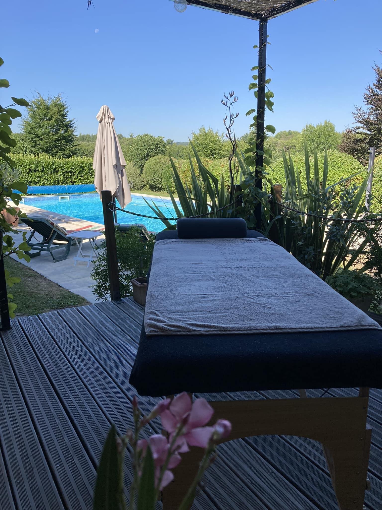 Des massages professionnels et séances de shiatsu peuvent être pratiqués au bord de la piscine, sur réservation.