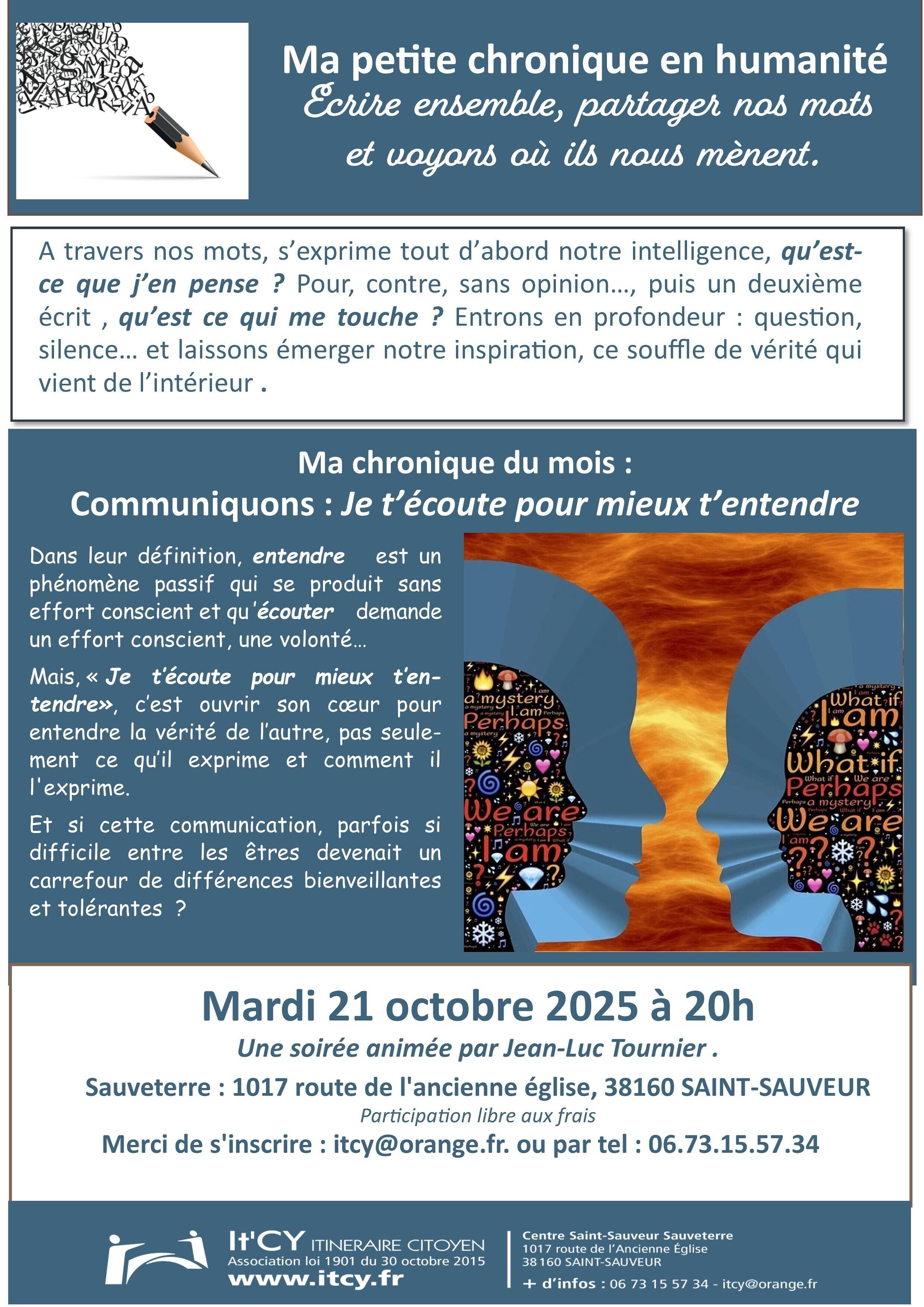 Ecrire ensemble, partager nos mots et voyons où ils nous mènent : une rencontre d'échanges a parti de nos écrits sur un thème et ce mois c'est : Communiquons : Je t'écoute pour mieux t'entendre