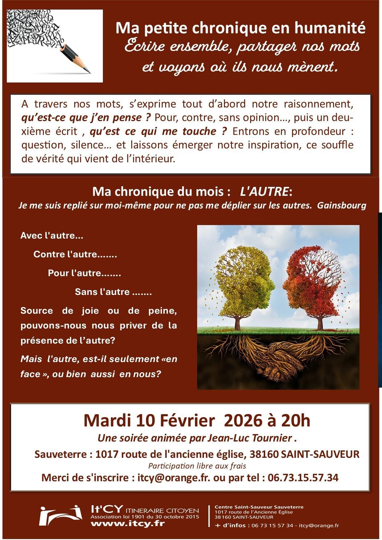 Une réflexion collective sur un thème d'humanité : en fevrier le thème est " L'Autre" . des temps d'écriture sur le thème et un partage de réflexion