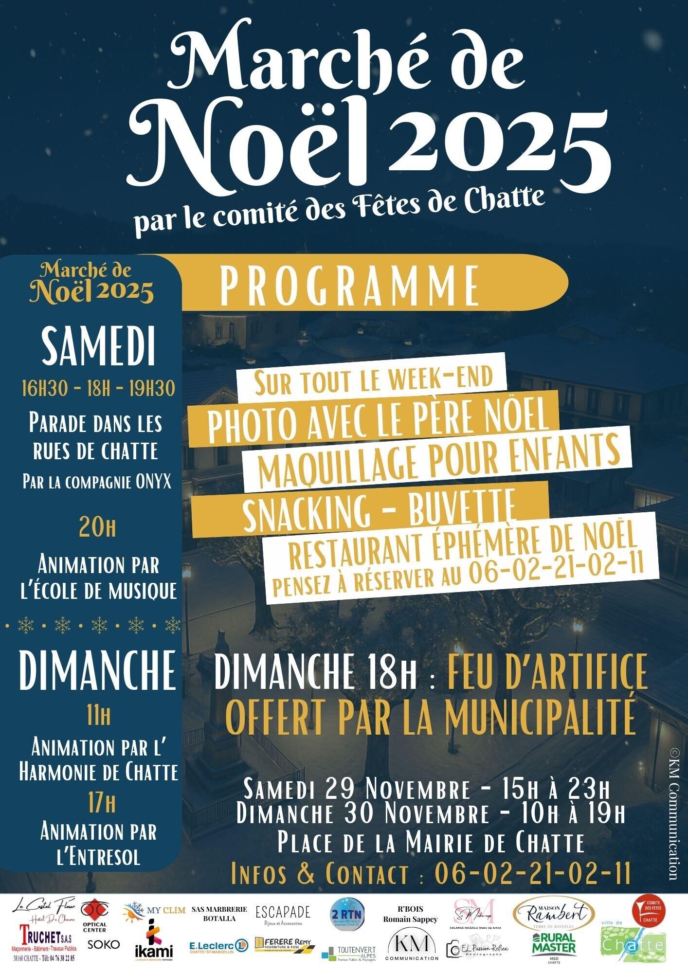 Le comité des fêtes et la commune de Chatte vous donnent rendez-vous le samedi 29 novembre et le dimanche 30 novembre pour une nouvelle édition du Marché de Noël ! De nombreuses animations sont prévues et des nouveautés !