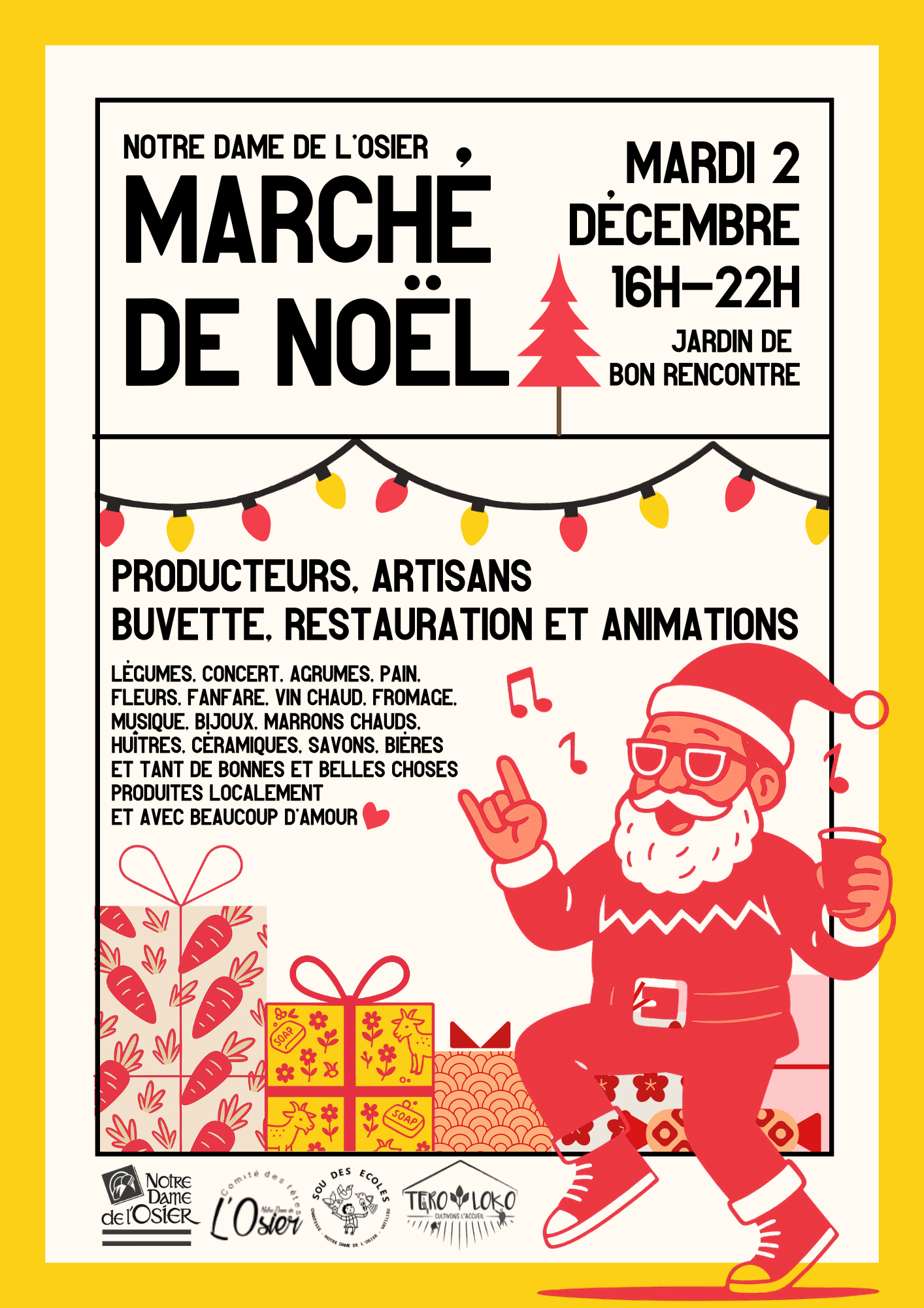 Cette année, le Marché de Noël, coordonné par Tero Loko, en partenariat avec le Comité des fêtes, le Sou des Ecoles et la mairie, est rejoint par l'ACCA de Notre-Dame-de-l'Osier. Les chasseurs proposeront une soupe à l'oignon, pour se réchauffer en cas de grand froid, ainsi que des marrons chauds et du pâté de chevreuil de leur confection. L'EHPAD tiendra également un stand de gâteaux pour financer des projets pour les résidents.
