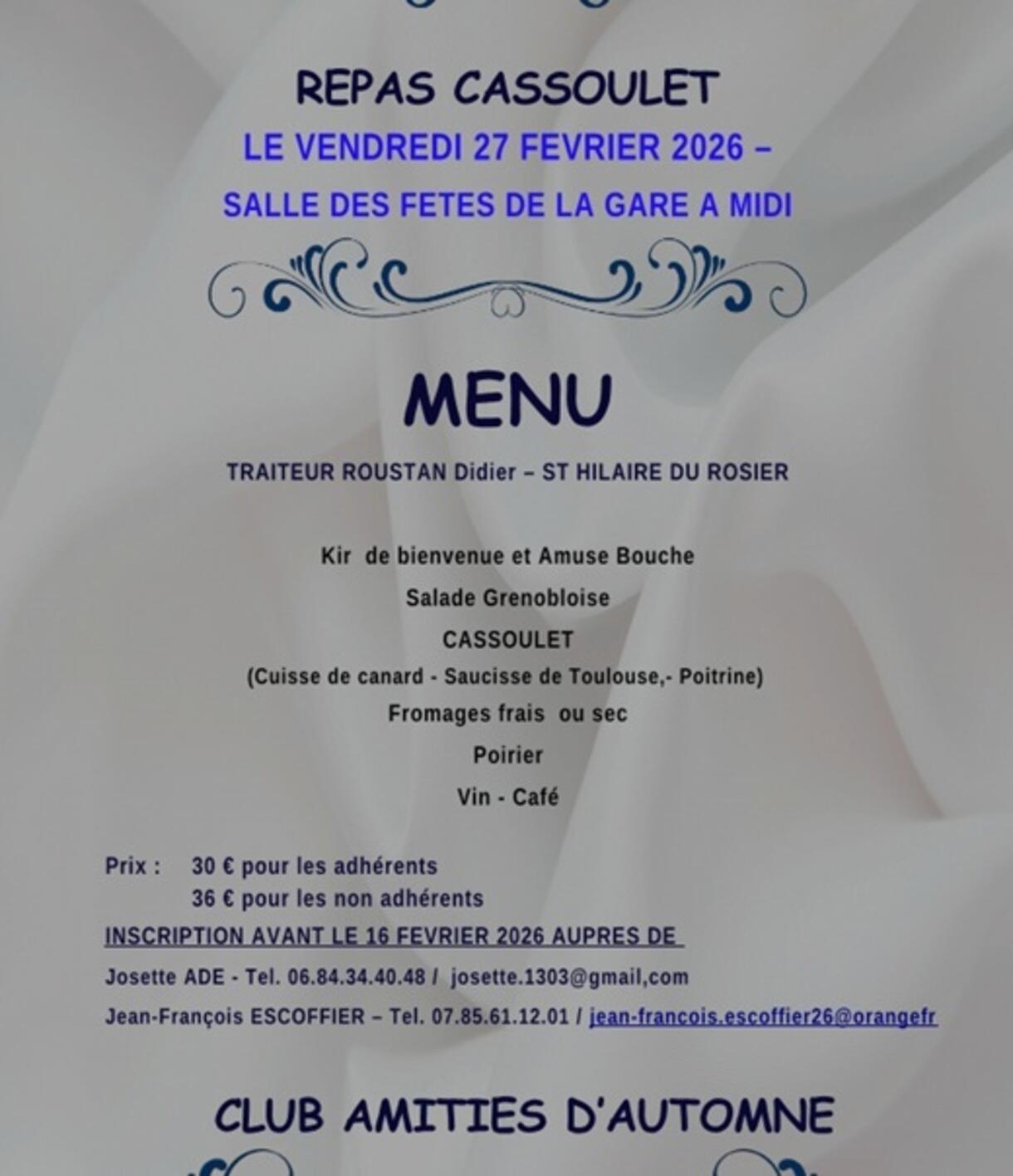 Ce repas est l'occasion de se retrouver autour d'un cassoulet généreux et préparé dans la tradition, composé de cuisse de canard, de saucisse de Toulouse et de poitrine. Le déjeuner débute par un apéritif de bienvenue et une salade grenobloise, avant de laisser place au plat principal. Fromages et dessert viennent conclure ce moment convivial, propice aux échanges et au partage dans une ambiance chaleureuse et amicale.