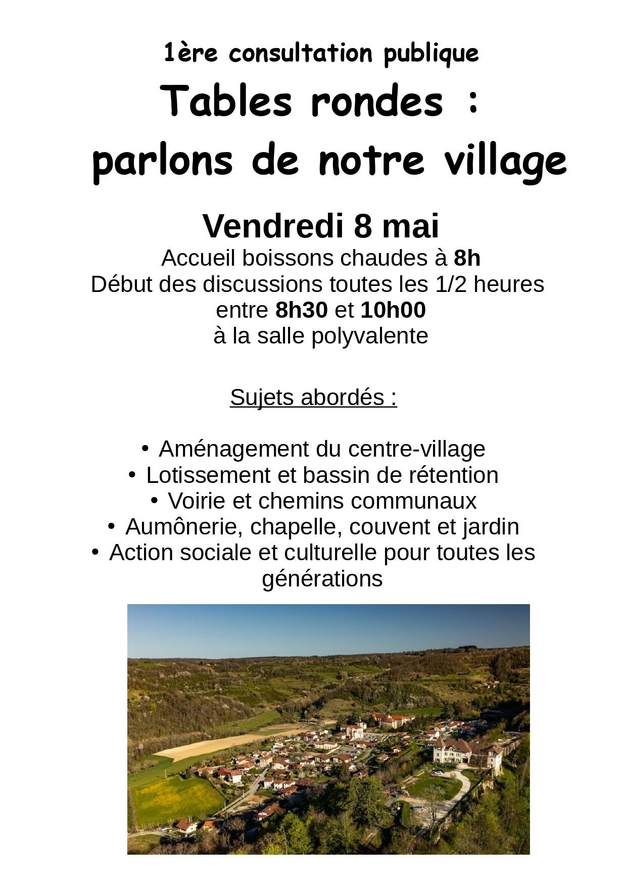 Consultation publique des habitants menée par les élus autour de différents thèmes : aménagement du centre-village, problématiques de voirie et des chemins communaux, avenir des bâtiments communaux (couvent etc.) et action sociale et culturelle.