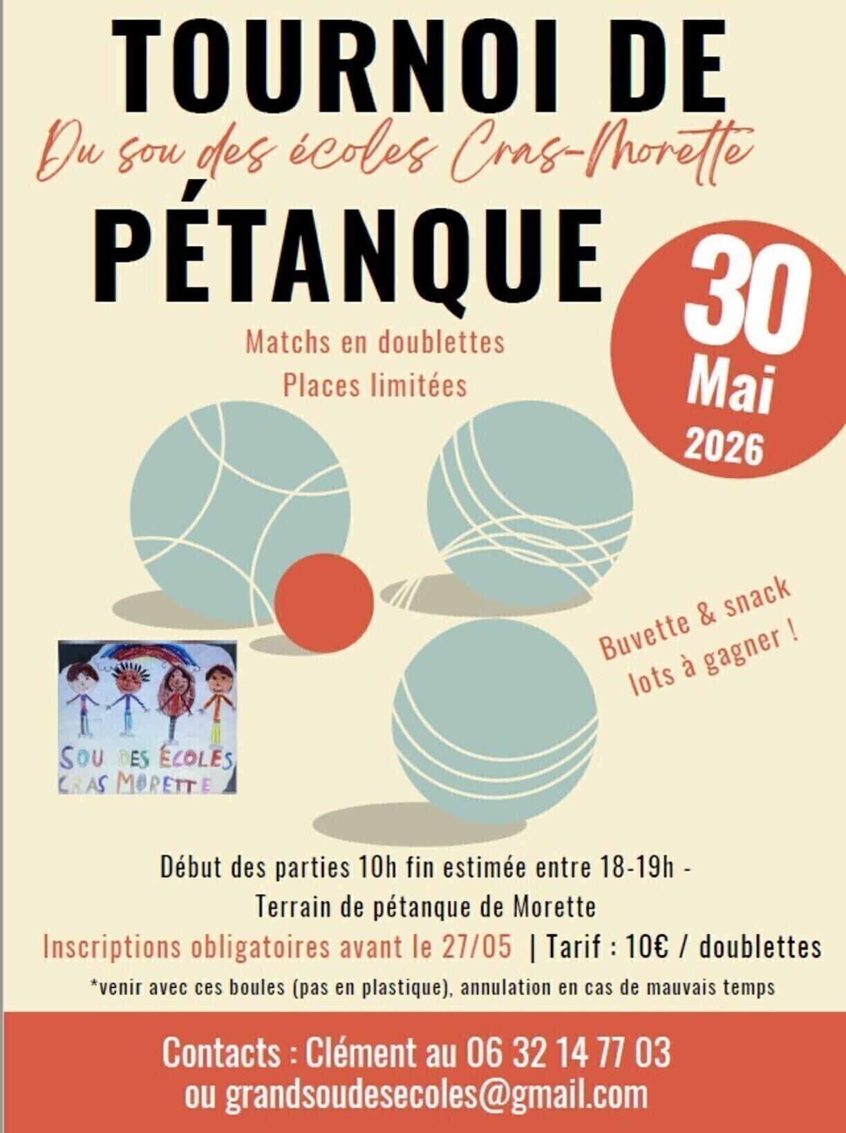 Nous avons le plaisir de vous proposer un tournoi de pétanque en doublette à Morette. Annulation en cas de mauvais temps.