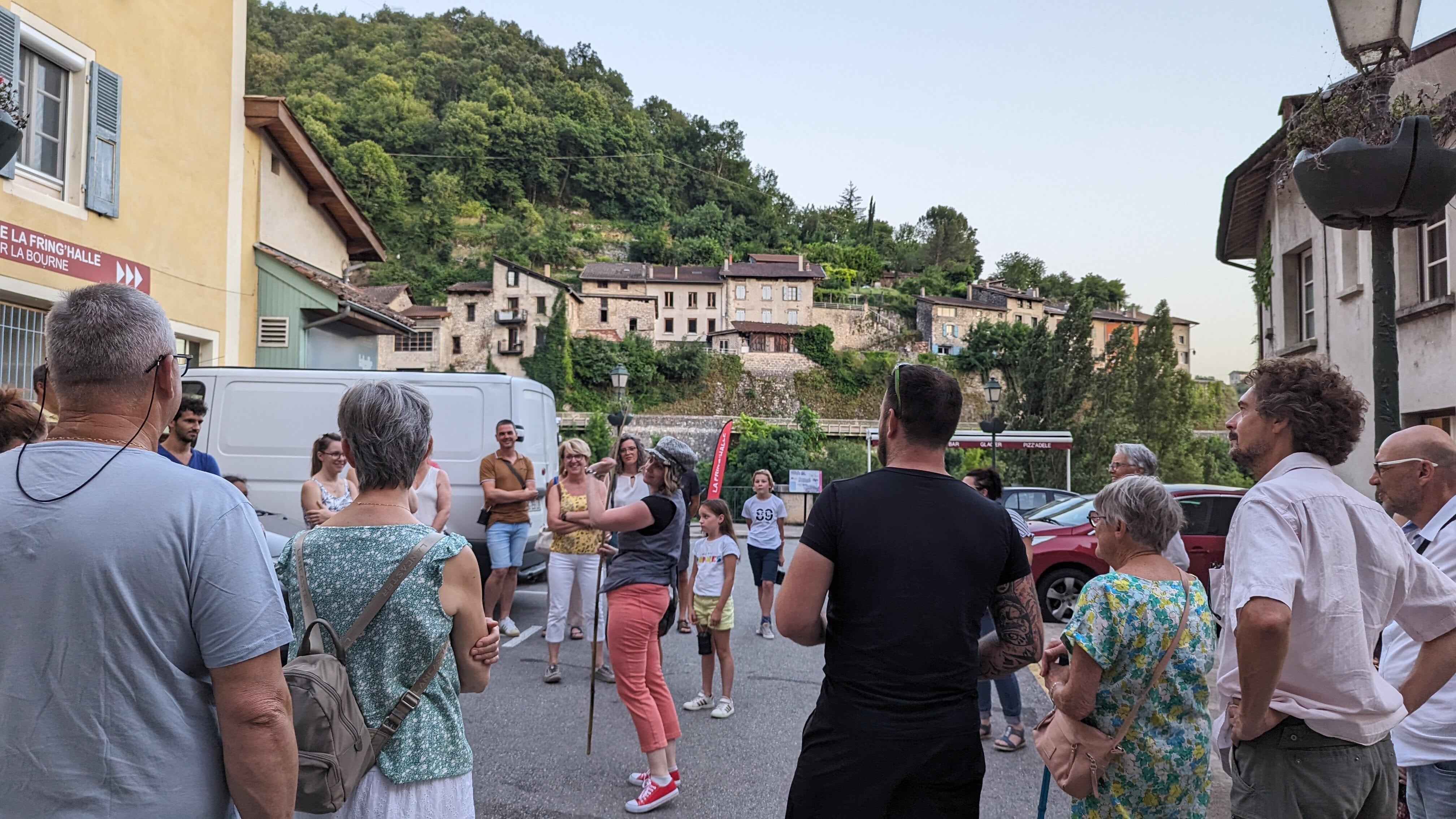 La tournée se poursuit à la place de la halle où le commerce et la vie quotidienne se mêlent. En montant dans le village, vous passez par la Rue du Temple où se sont déroulés d'intenses combats jadis. Par le Chemin de la Corbeille qui monte petit à petit vers le château des Bérenger-Sassenage. Le Chemin du Bourg où colporteurs et randonneurs circulent.