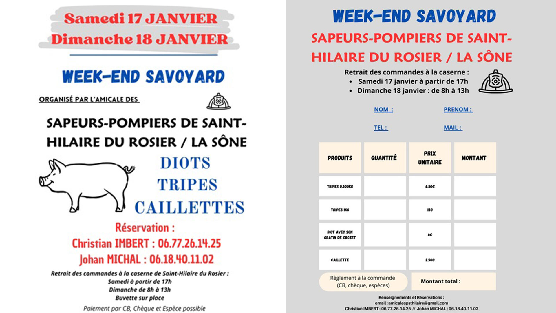 l'Amicale des Sapeurs Pompiers de Saint-Hilaire du Rosier organise un week-end savoyard, samedi 17 et dimanche 18 janvier 2026.
